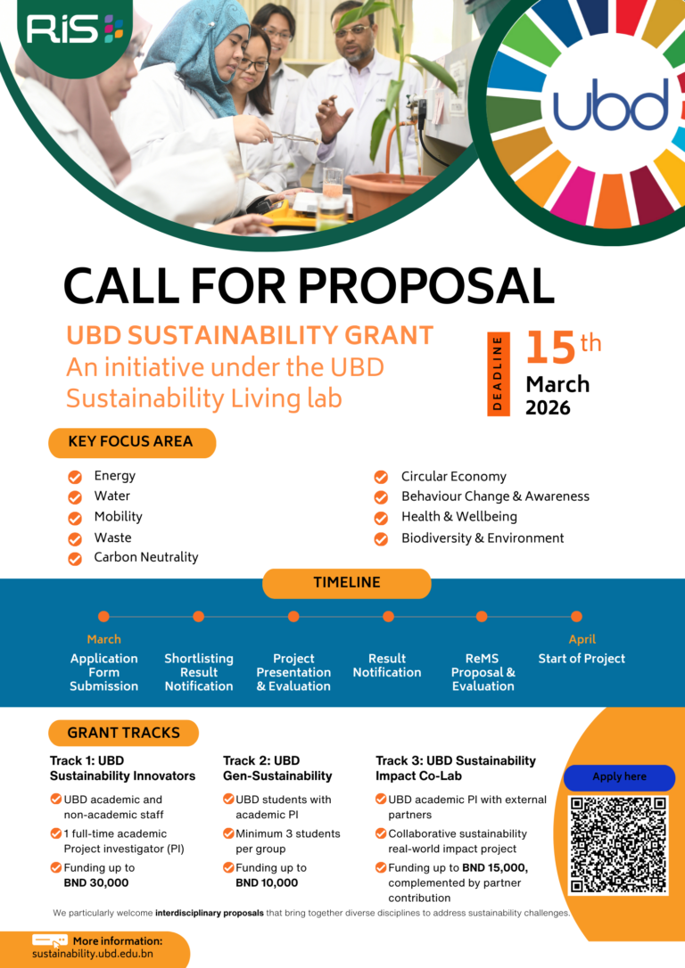 All proposals should align with UBD’s Sustainability Masterplan and demonstrate measurable outcomes that support national and institutional goals.